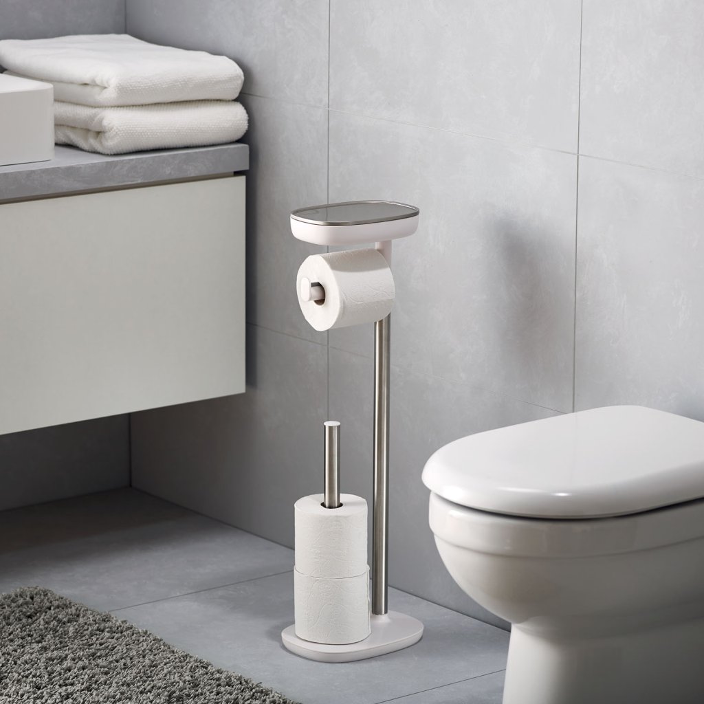 Elegantní stojan na toaletní papír z kombinace nerezové oceli a plastu. Stojan pojme až čtyři role a je vybaven praktickou odkládací plochou s vyklápěcím prostorem na sanitární potřeby. Na samotném držáku je rovněž silikonový proužek, usnadňující odtrhávání papíru.